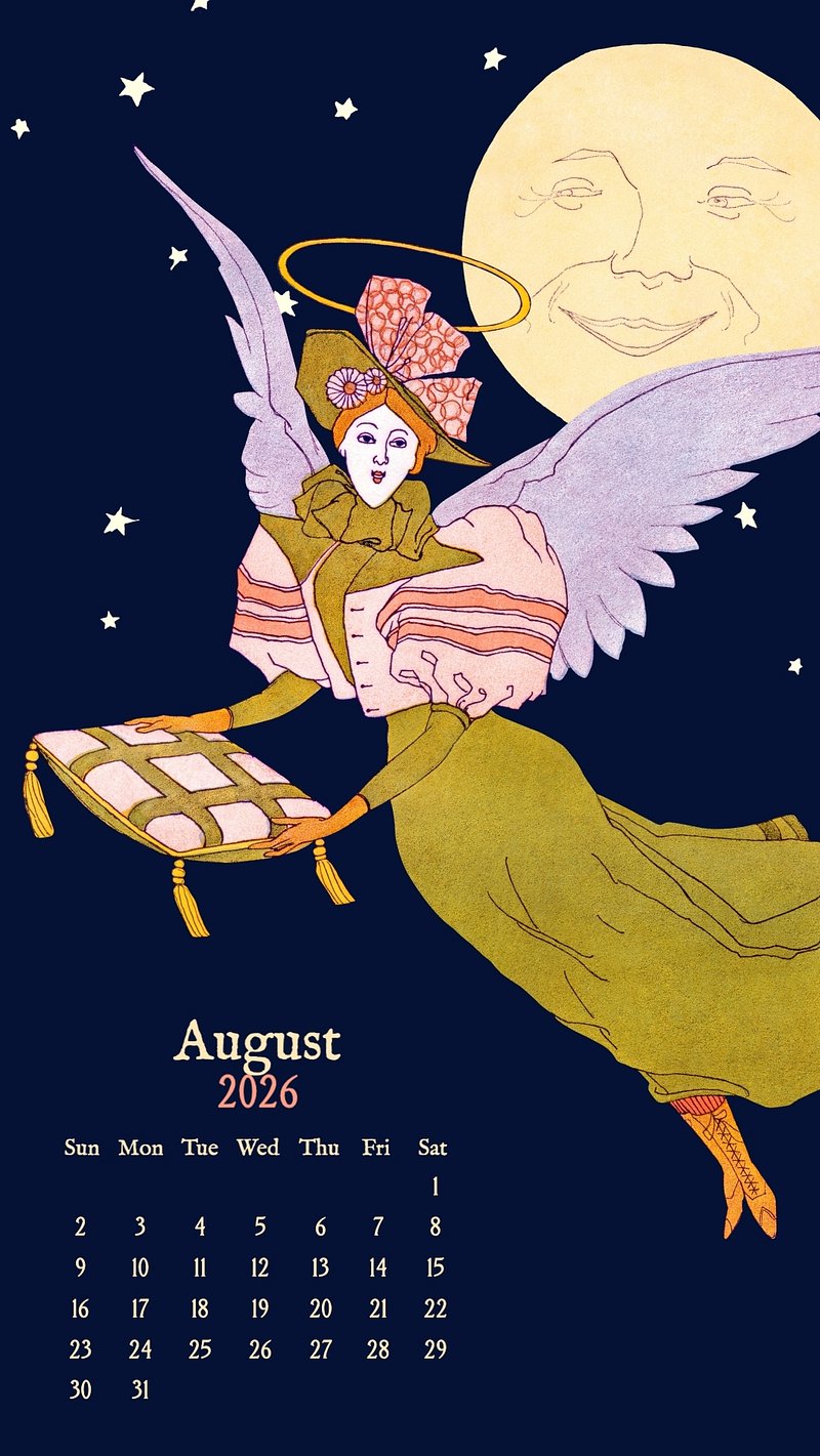 Vintage August 2026 calendar mobile wallpaper, original illustration by Ralph Meriman https://www.rawpixel.com/image/24704190/image-wallpaper-iphone-mobileView license