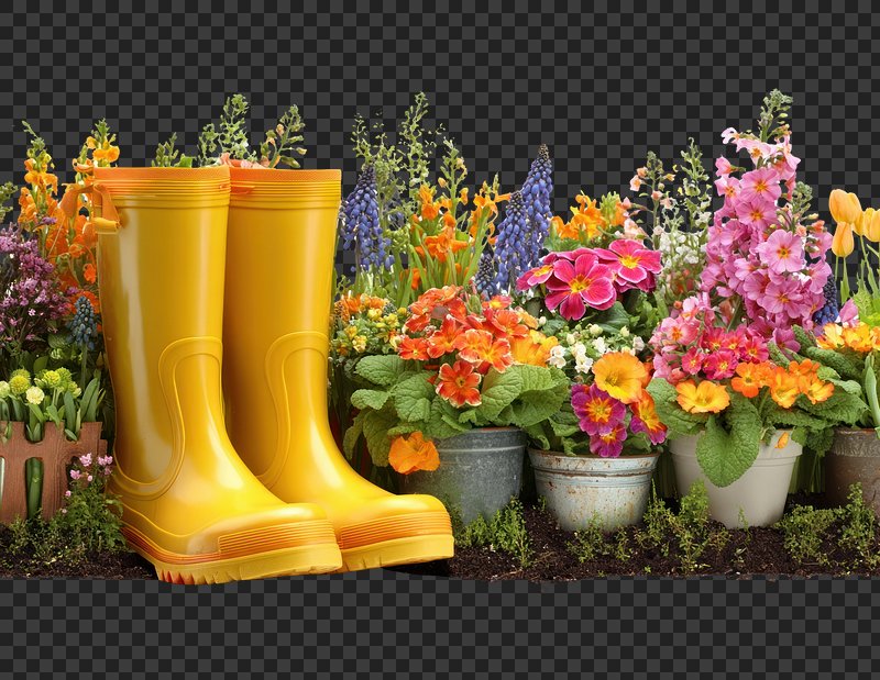 PNG Vibrant garden with yellow boots https://www.rawpixel.com/image/24966196/png-vibrant-garden-with-yellow-bootsView license