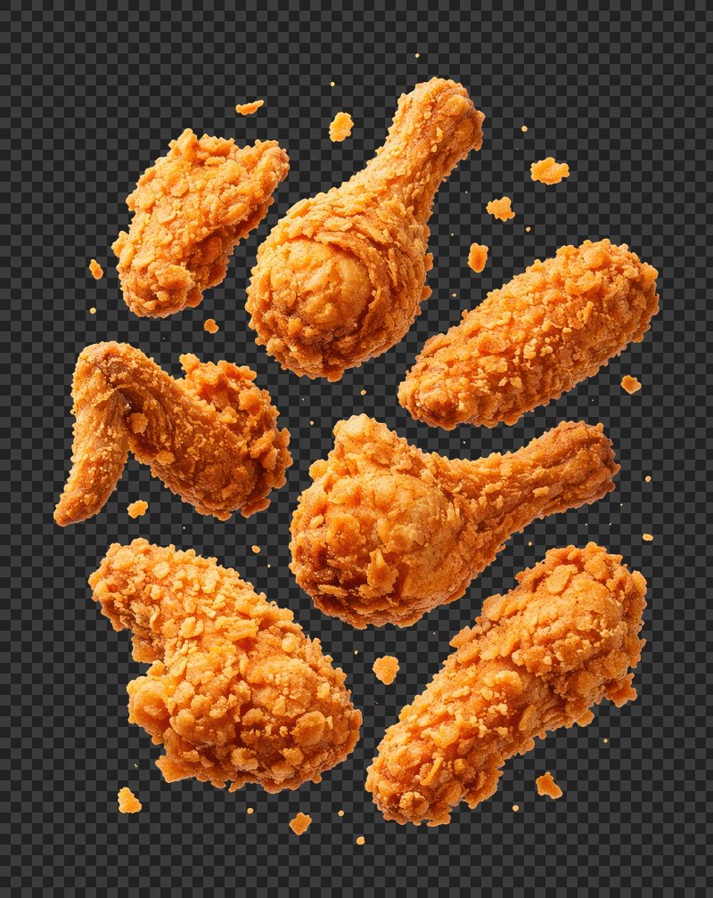 PNG Crispy fried chicken pieces floating. https://www.rawpixel.com/image/26224933/png-crispy-fried-chicken-pieces-floatingView license