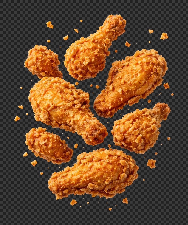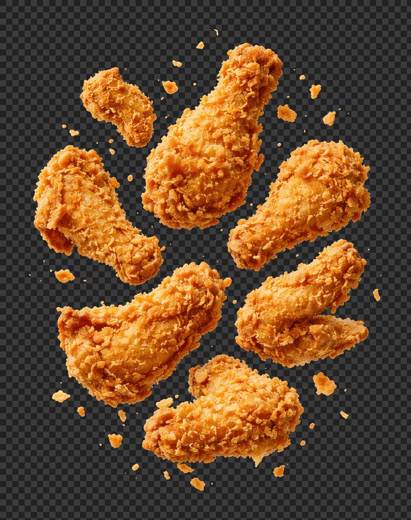 PNG Crispy fried chicken pieces floating. https://www.rawpixel.com/image/26226134/png-crispy-fried-chicken-pieces-floatingView license