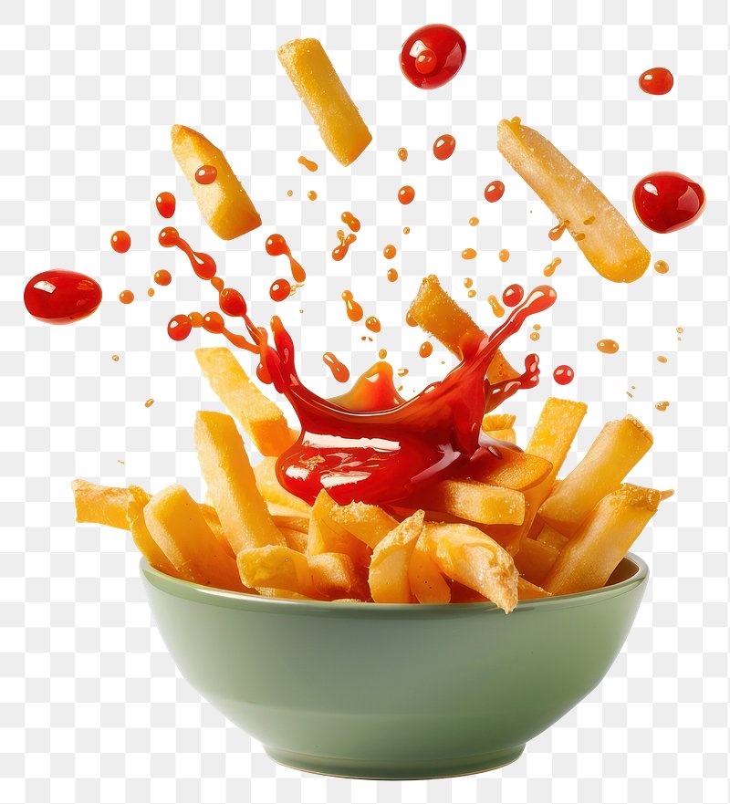 PNG Exploding french fries sauce food ketchup bowl. https://www.rawpixel.com/image/15525496/png-exploding-french-fries-sauce-food-ketchup-bowlView license