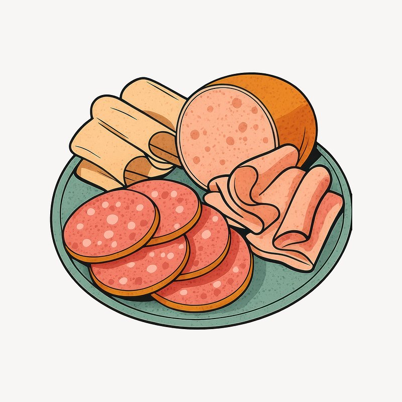 Assorted deli meats platter illustration. https://www.rawpixel.com/image/24718900/assorted-deli-meats-platter-illustrationView license