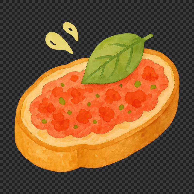 PNG Watercolor bruschetta with basil. https://www.rawpixel.com/image/18772284/png-watercolor-bruschetta-with-basilView license
