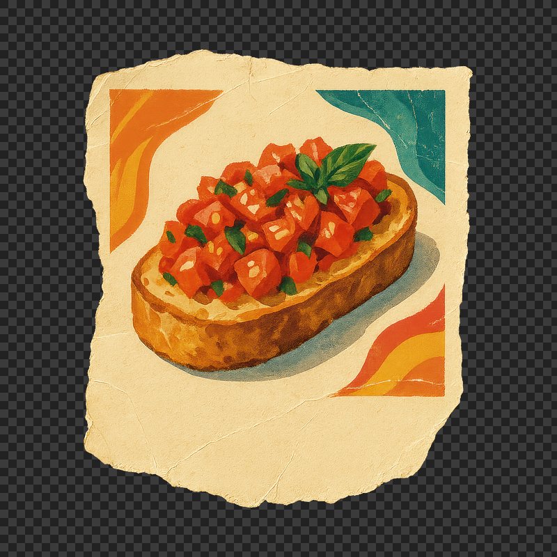 PNG Colorful vintage bruschetta illustration. https://www.rawpixel.com/image/24409337/png-colorful-vintage-bruschetta-illustrationView license