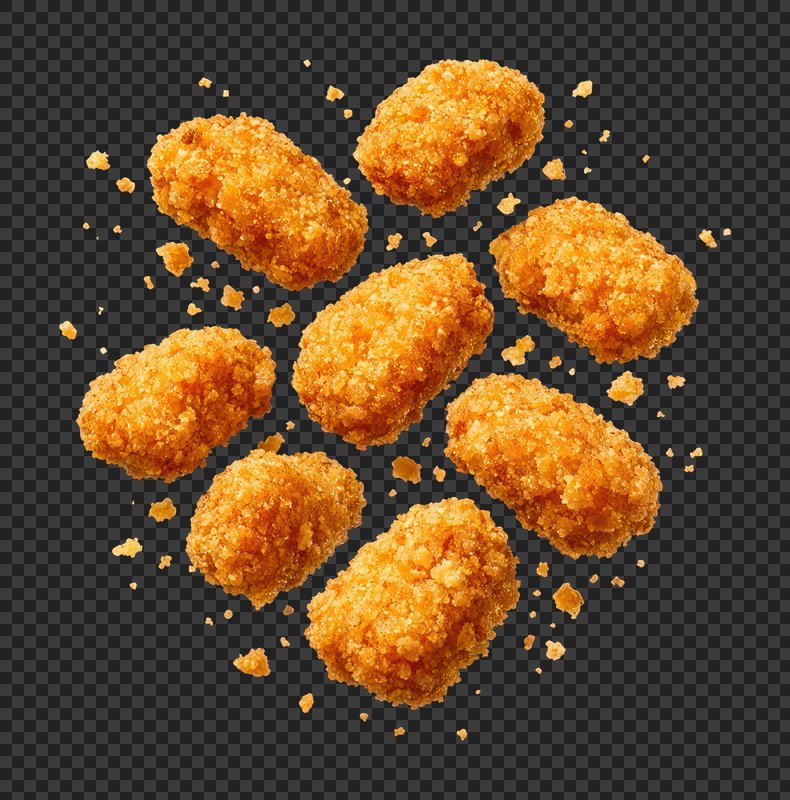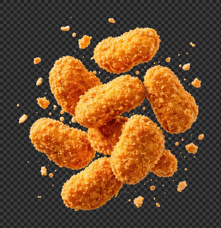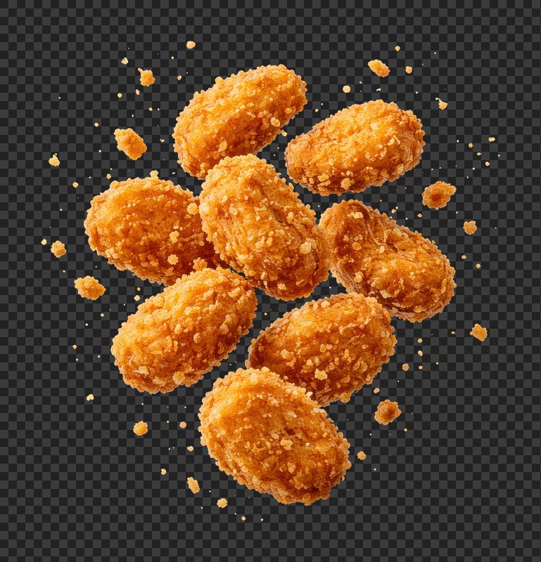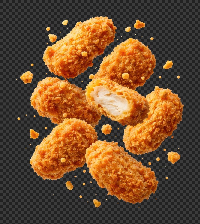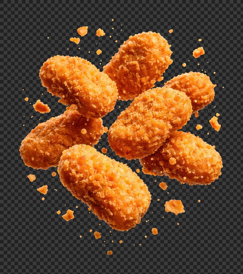 PNG Crispy golden chicken nuggets floating. https://www.rawpixel.com/image/26258517/png-crispy-golden-chicken-nuggets-floatingView license