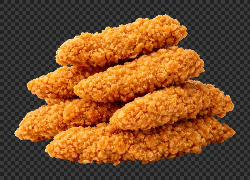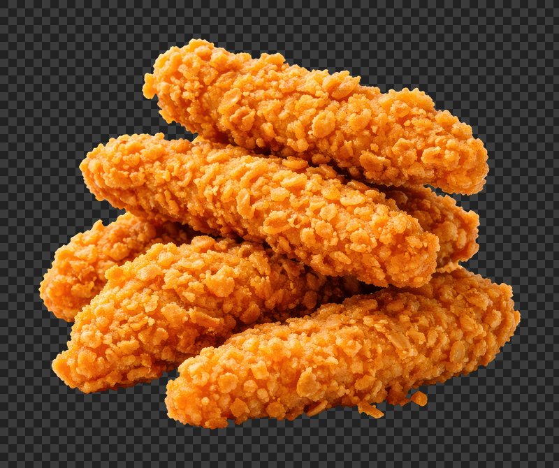 PNG Crispy golden chicken tenders stack. https://www.rawpixel.com/image/25862074/png-crispy-golden-chicken-tenders-stackView license