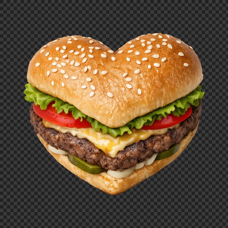PNG Heart-shaped burger with toppings. https://www.rawpixel.com/image/25556510/png-heart-shaped-burger-with-toppingsView license