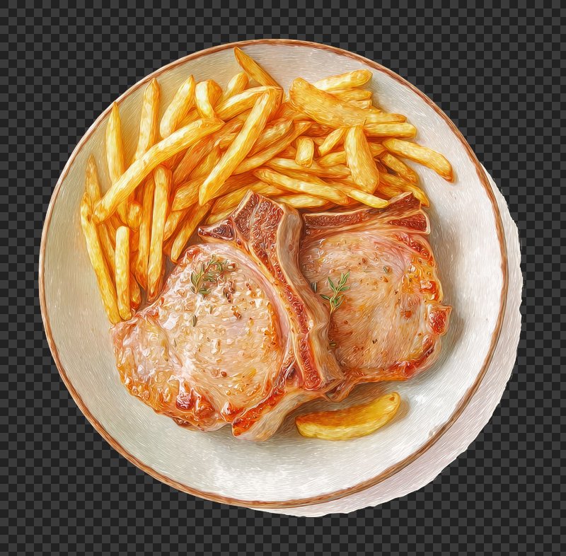 PNG A plate of pork chop steak with french fried food illustration chops. https://www.rawpixel.com/image/18580088/png-plate-pork-chop-steak-with-french-fried-food-illustration-chopsView license