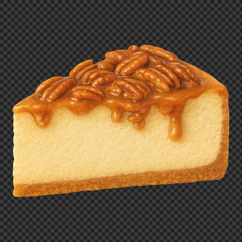 PNG Delicious pecan caramel cheesecake slice. https://www.rawpixel.com/image/18460941/png-delicious-pecan-caramel-cheesecake-sliceView license