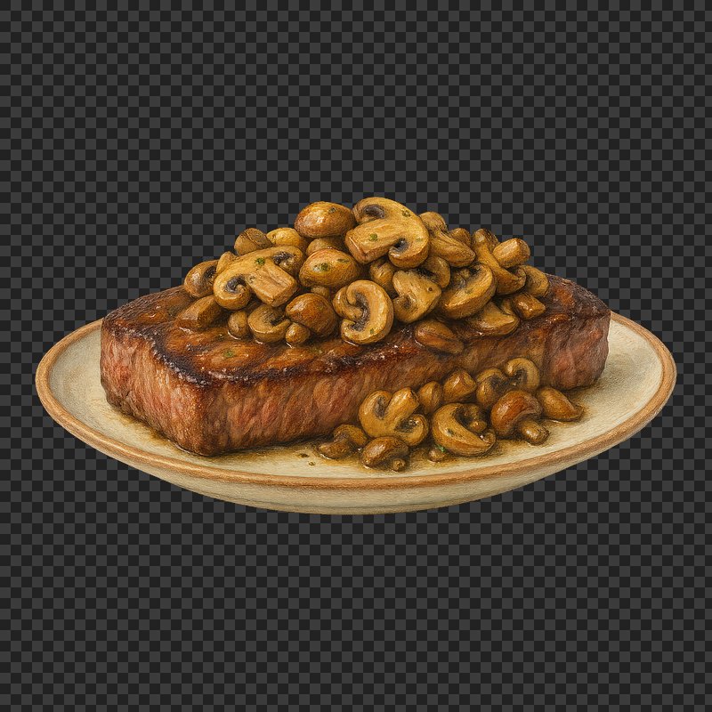PNG Juicy steak with sautéed mushrooms. https://www.rawpixel.com/image/18460536/png-juicy-steak-with-sauteed-mushroomsView license