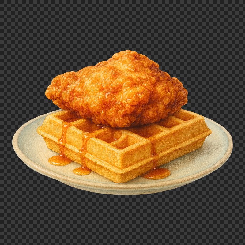 PNG Crispy chicken atop waffles. https://www.rawpixel.com/image/18460778/png-crispy-chicken-atop-wafflesView license