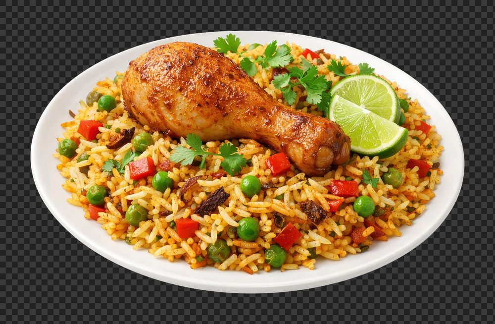 PNG Colorful dish with chicken leg. https://www.rawpixel.com/image/26359600/png-colorful-dish-with-chicken-legView license