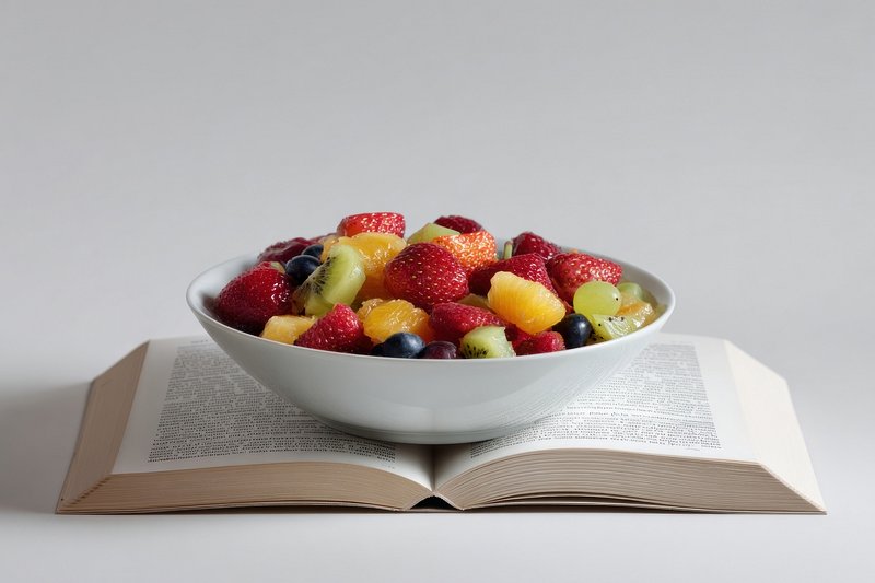 Bowl of fruit salad with an open book white strawberries publication. https://www.rawpixel.com/image/18483221/bowl-fruit-salad-with-open-book-white-strawberries-publicationView license