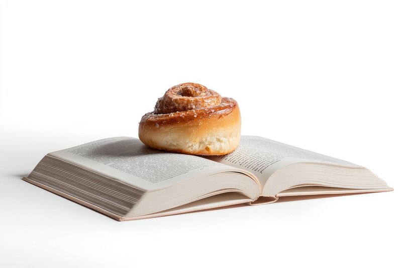 Cinnamon roll on an open book background white food. https://www.rawpixel.com/image/18483070/cinnamon-roll-open-book-background-white-foodView license
