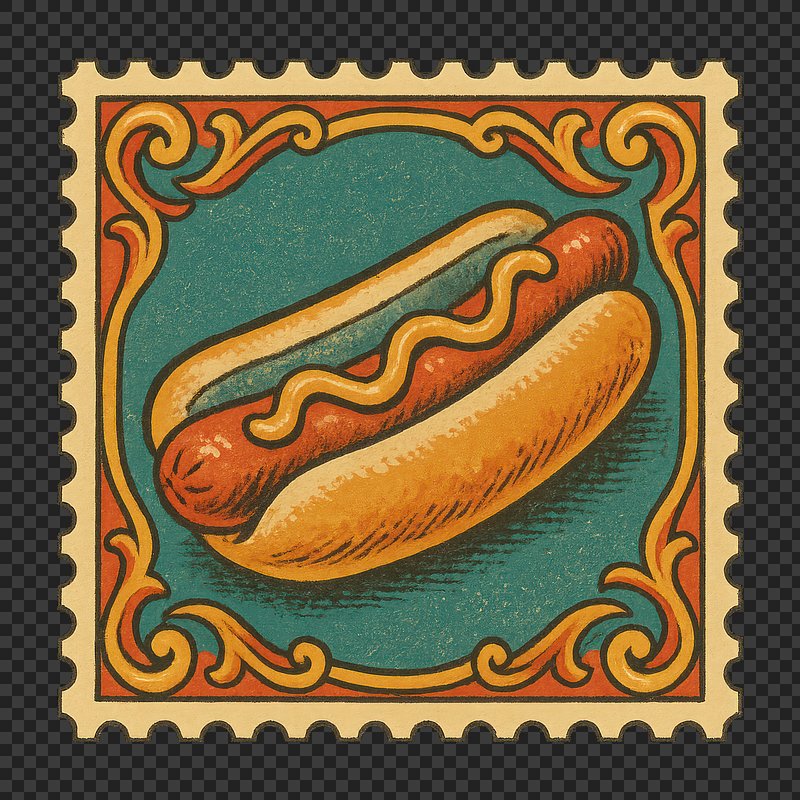 PNG Vintage hotdog postage stamp illustration. https://www.rawpixel.com/image/18231342/png-vintage-hotdog-postage-stamp-illustrationView license