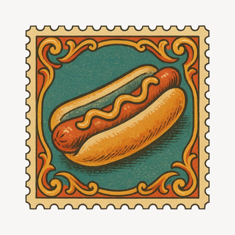 Vintage hotdog postage stamp illustration. https://www.rawpixel.com/image/18660442/vintage-hotdog-postage-stamp-illustrationView license