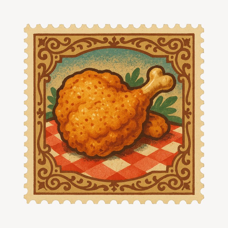 Vintage fried chicken stamp illustration. https://www.rawpixel.com/image/18660468/vintage-fried-chicken-stamp-illustrationView license
