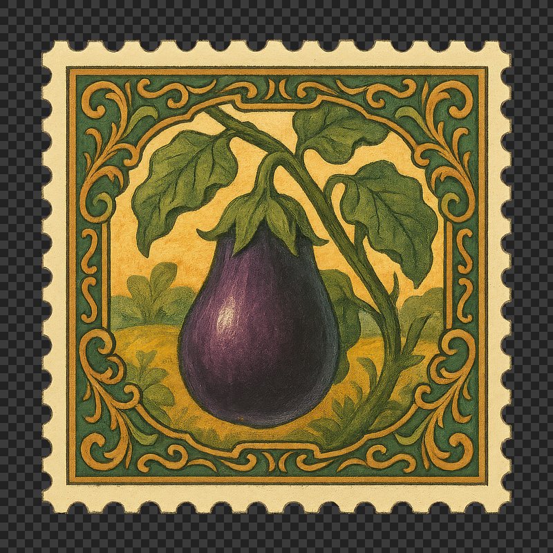 PNG Vintage eggplant postage stamp illustration. https://www.rawpixel.com/image/18231421/png-vintage-eggplant-postage-stamp-illustrationView license