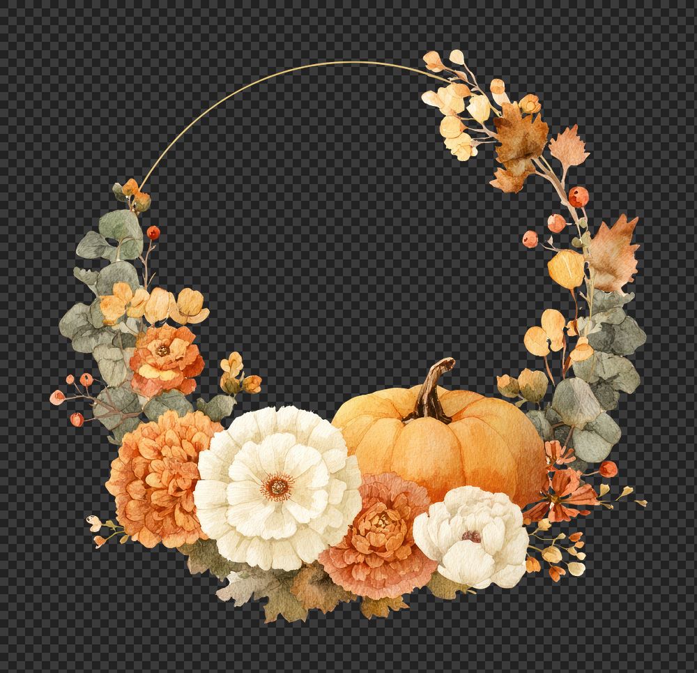 PNG Autumnal floral pumpkin wreath illustration. https://www.rawpixel.com/image/20884709/png-autumnal-floral-pumpkin-wreath-illustrationView license