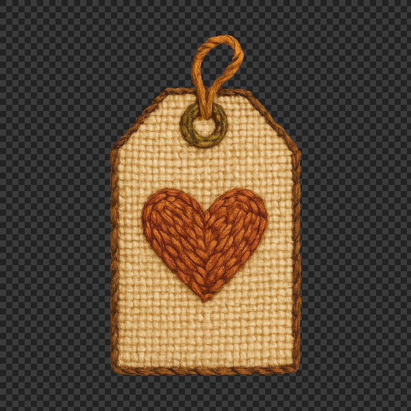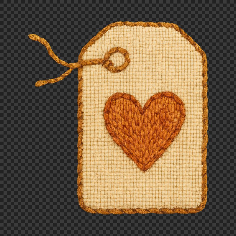 PNG Handcrafted tag with heart embroidery. https://www.rawpixel.com/image/24062834/png-handcrafted-tag-with-heart-embroideryView license