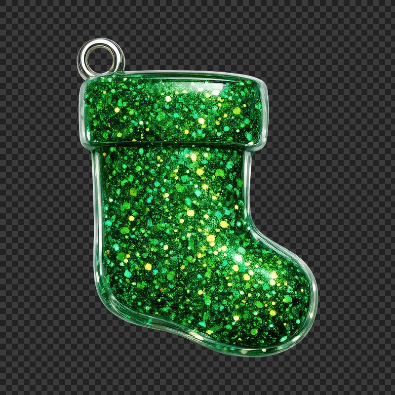 PNG Glittery green Christmas stocking charm. https://www.rawpixel.com/image/25280002/png-glittery-green-christmas-stocking-charmView license