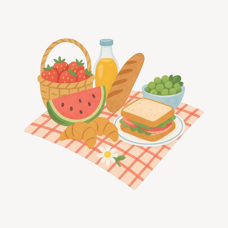 PNG Charming picnic illustration with food. https://www.rawpixel.com/image/18723638/png-charming-picnic-illustration-with-foodView license