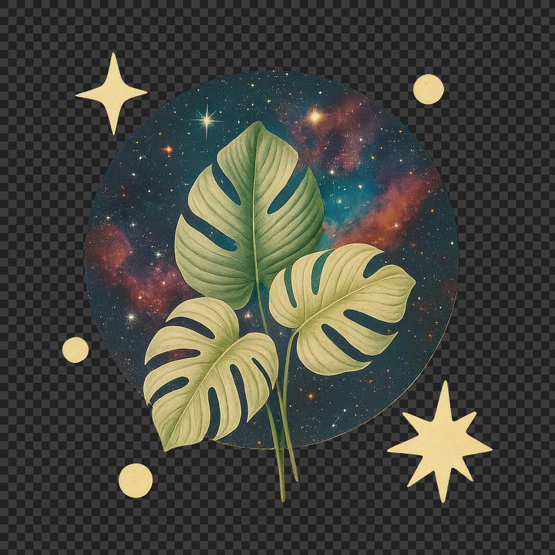 PNG Monstera leaves cosmic collage art. https://www.rawpixel.com/image/24270437/png-monstera-leaves-cosmic-collage-artView license