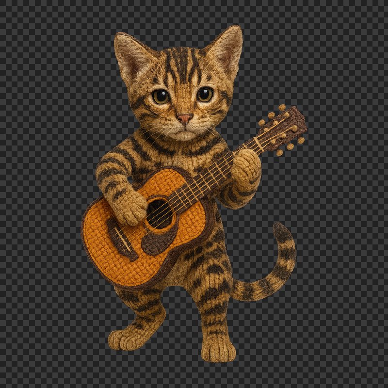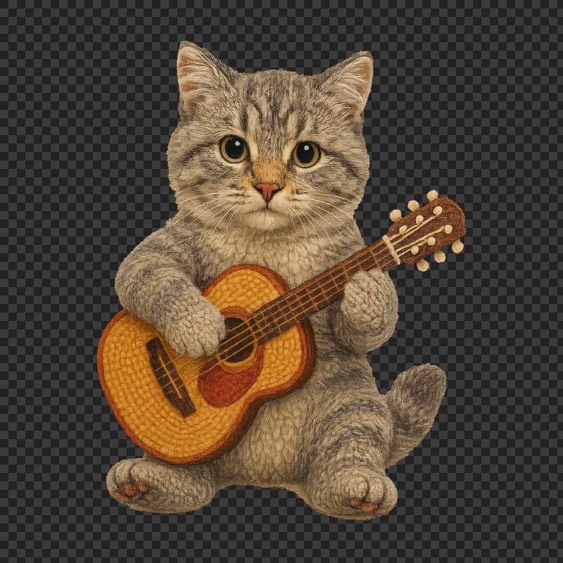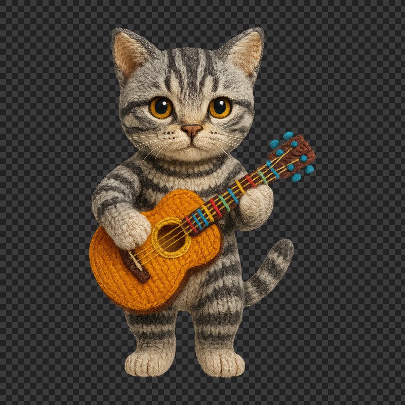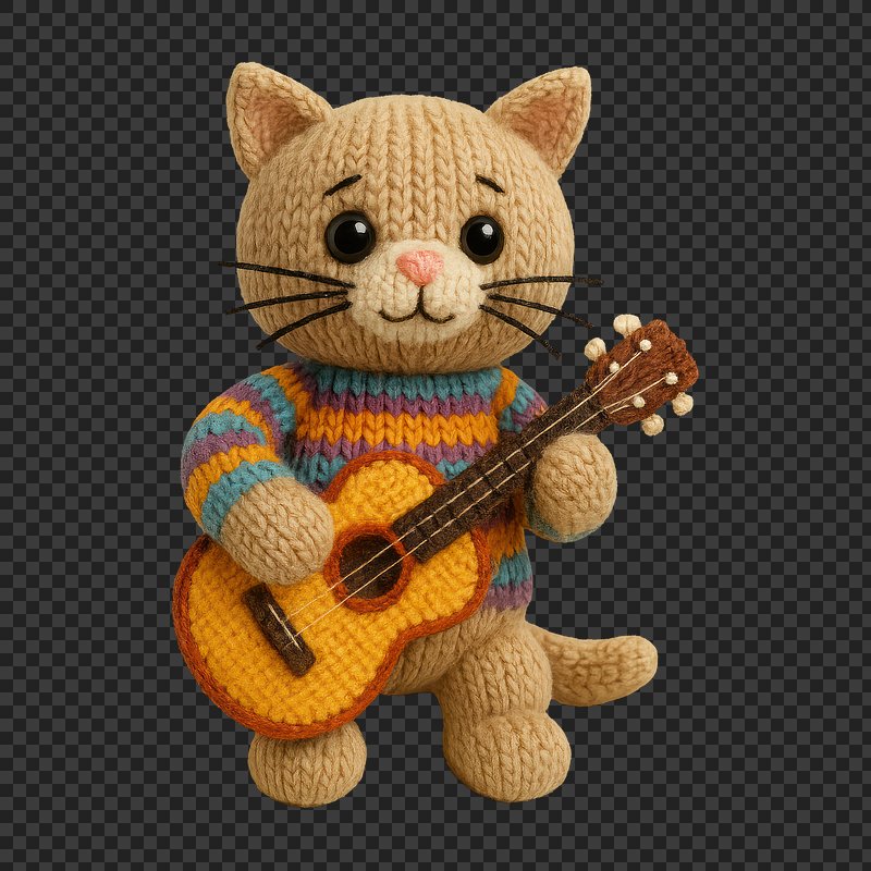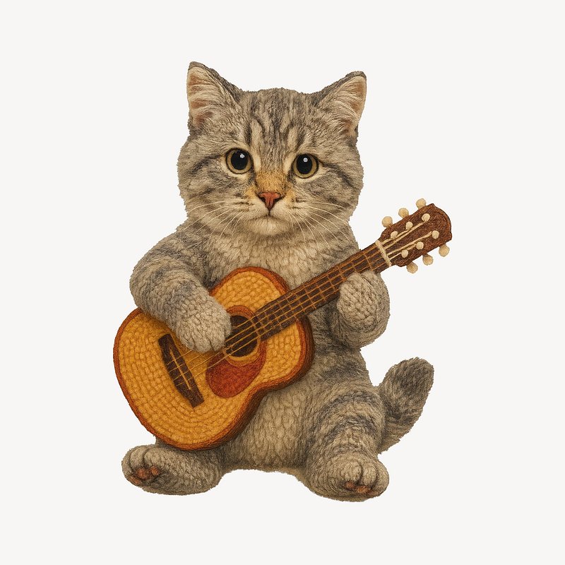 PNG Knitted cat playing guitar. https://www.rawpixel.com/image/24444837/png-knitted-cat-playing-guitarView license
