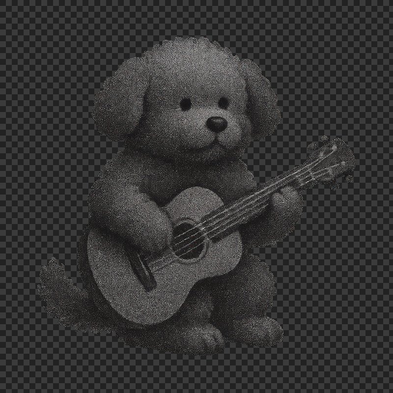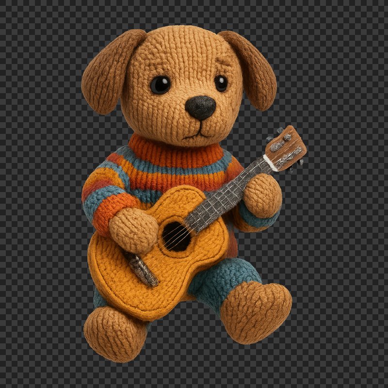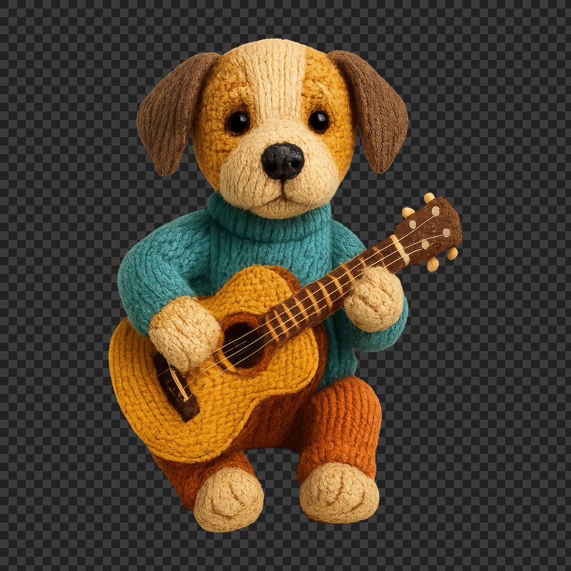 PNG Cute knitted dog playing guitar. https://www.rawpixel.com/image/24441014/png-cute-knitted-dog-playing-guitarView license