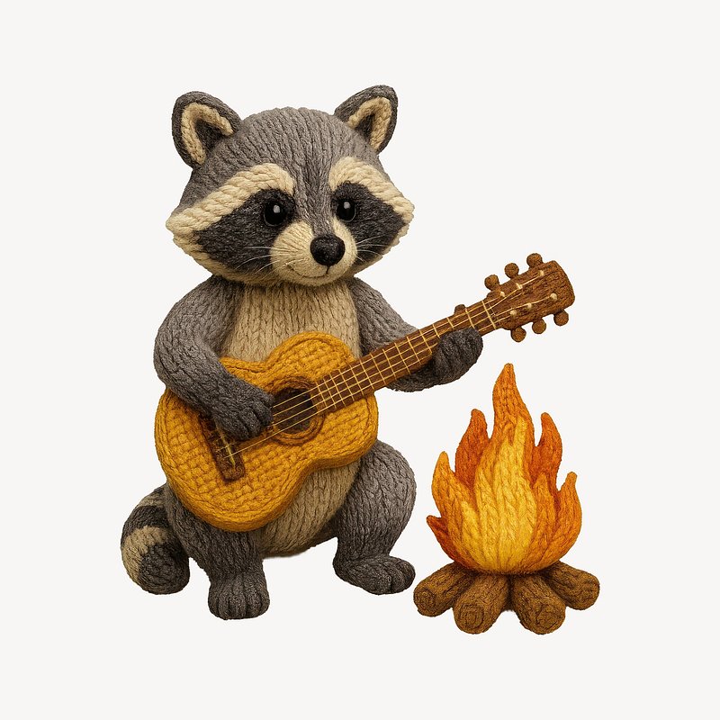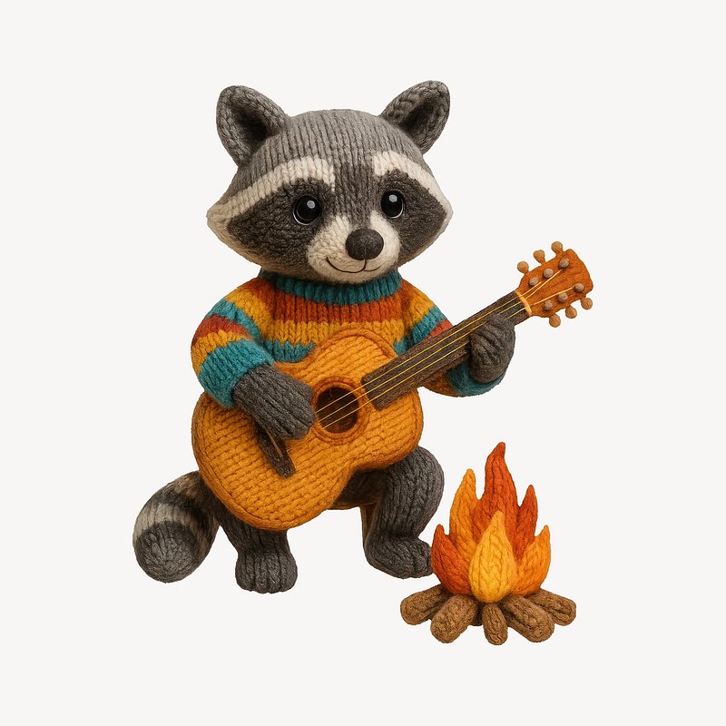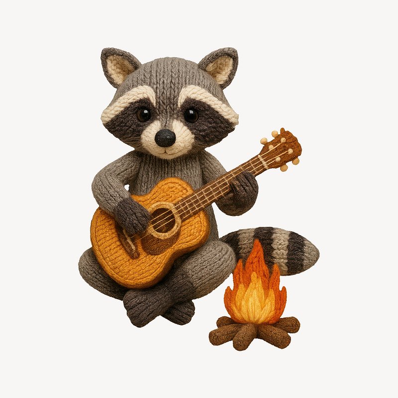Knit raccoon plays guitar by campfire. https://www.rawpixel.com/image/24607384/knit-raccoon-plays-guitar-campfireView license