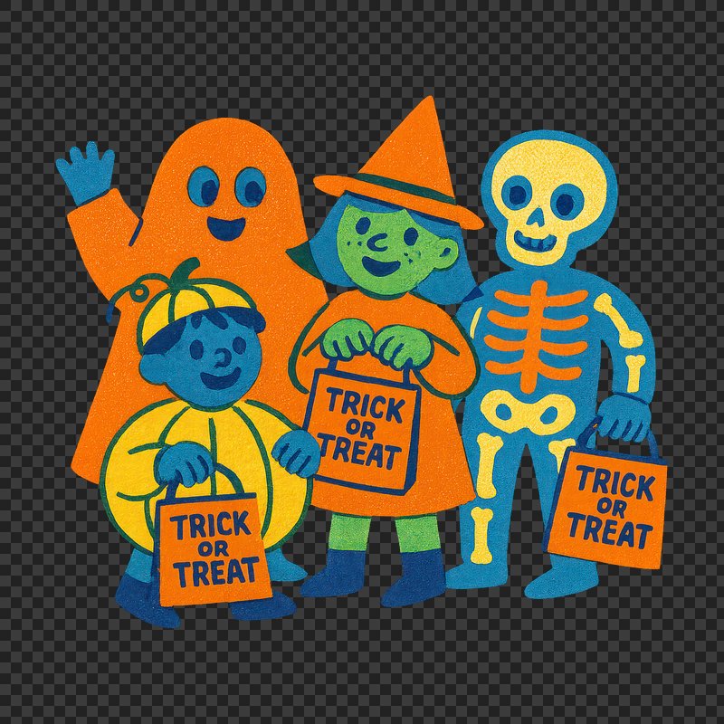 PNG Colorful cartoon trick-or-treaters illustration. https://www.rawpixel.com/image/21804603/png-colorful-cartoon-trick-or-treaters-illustrationView license