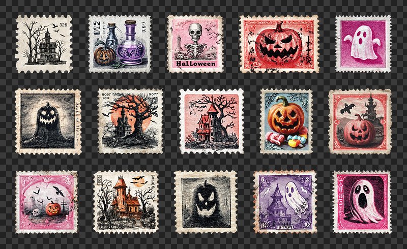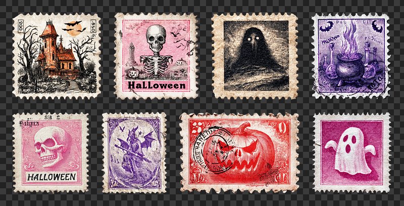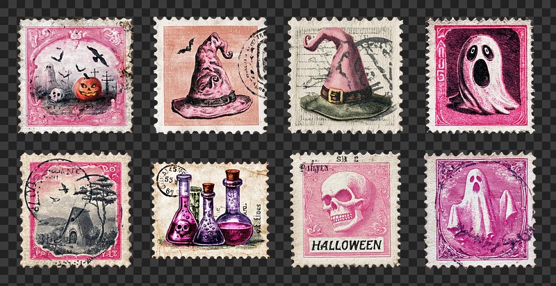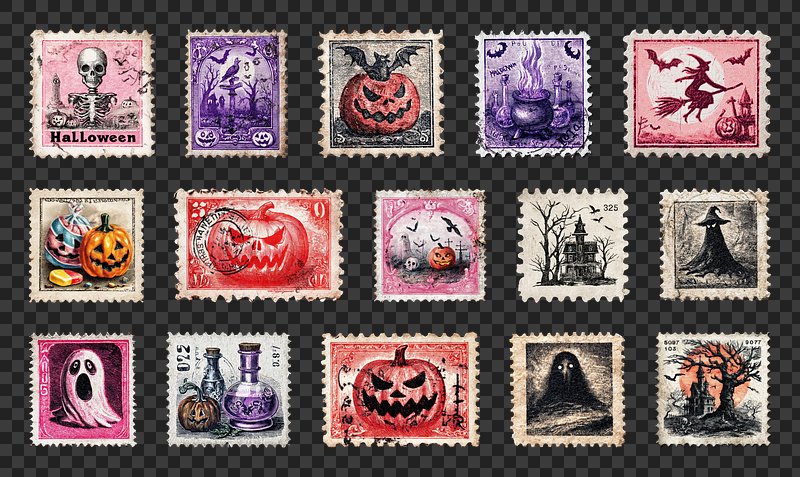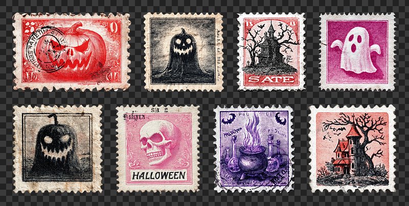 PNG Vintage Halloween postage stamp collection, element set on transparent background https://www.rawpixel.com/image/20435879/png-paper-artView license