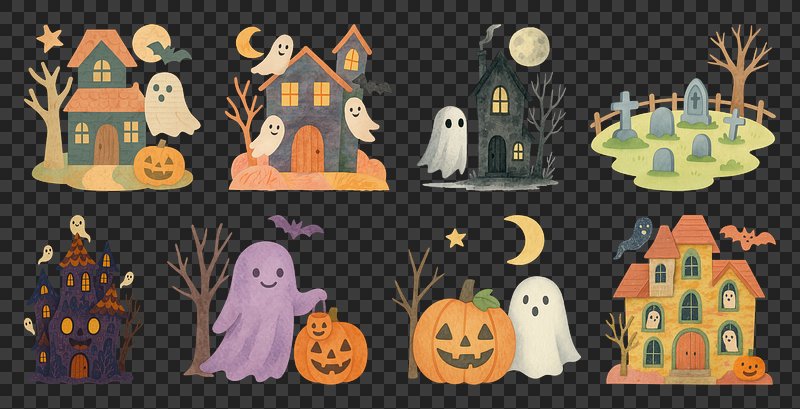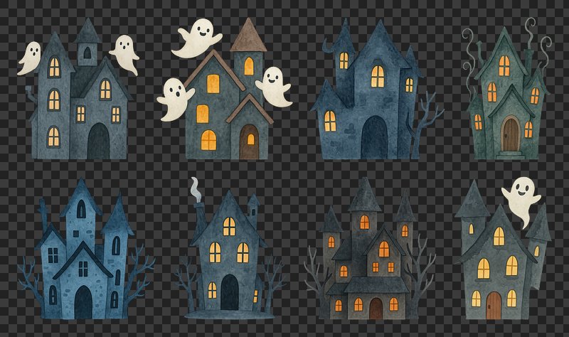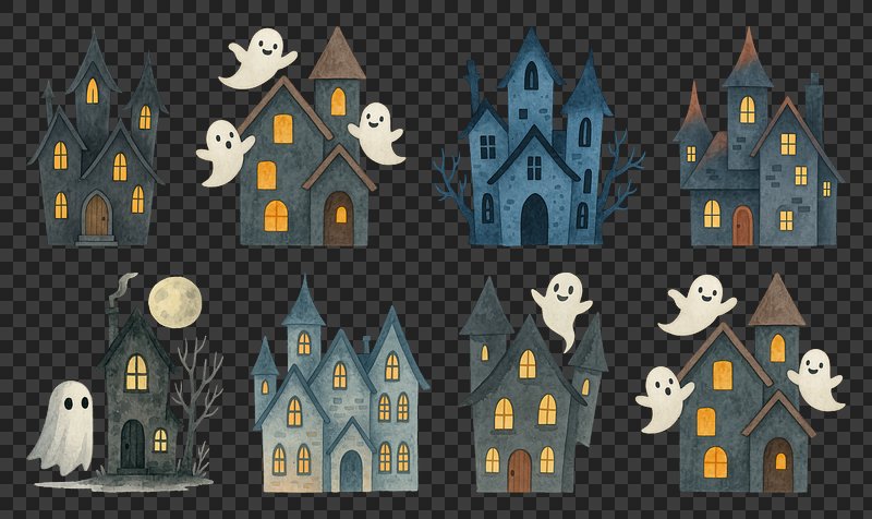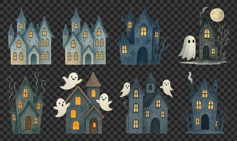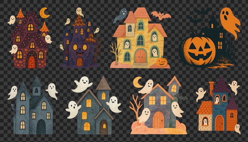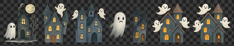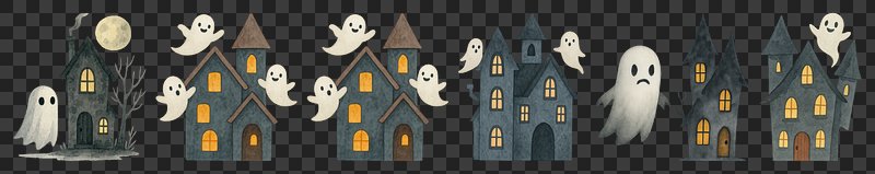 PNG Whimsical haunted houses with ghosts, element set on transparent background https://www.rawpixel.com/image/20626901/png-whimsical-haunted-houses-with-ghosts-element-set-transparent-backgroundView license
