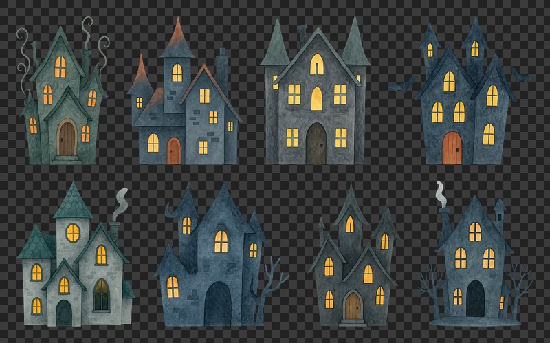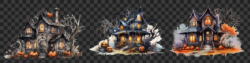 PNG Whimsical haunted houses illustration, element set on transparent background https://www.rawpixel.com/image/20226589/png-cartoon-watercolorView license