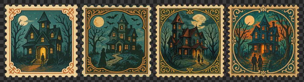 PNG Vintage Halloween postage stamp collection, element set on transparent background https://www.rawpixel.com/image/20435902/png-paper-houseView license