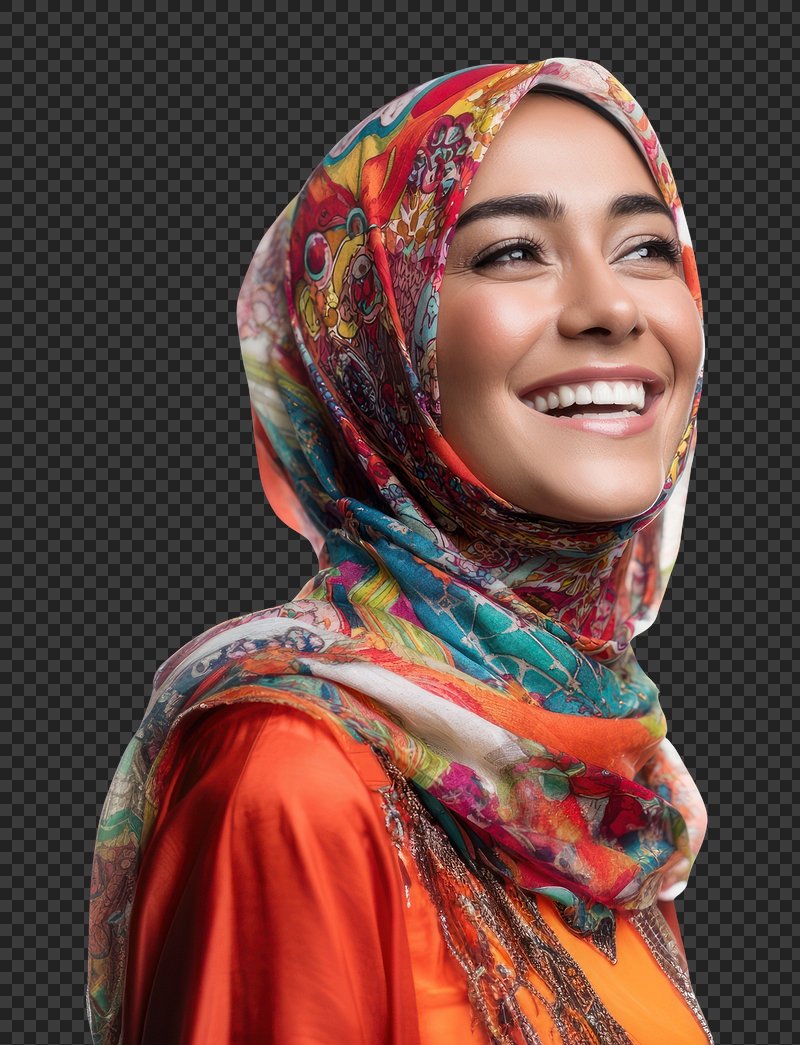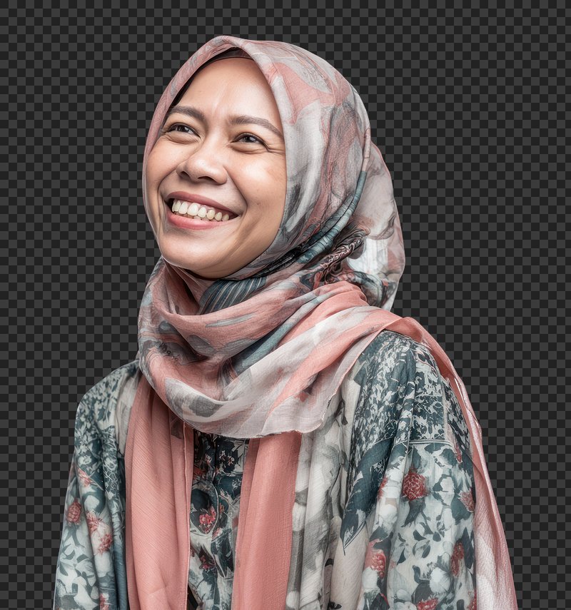 PNG Joyful woman wearing patterned hijab. https://www.rawpixel.com/image/25252709/png-joyful-woman-wearing-patterned-hijabView license