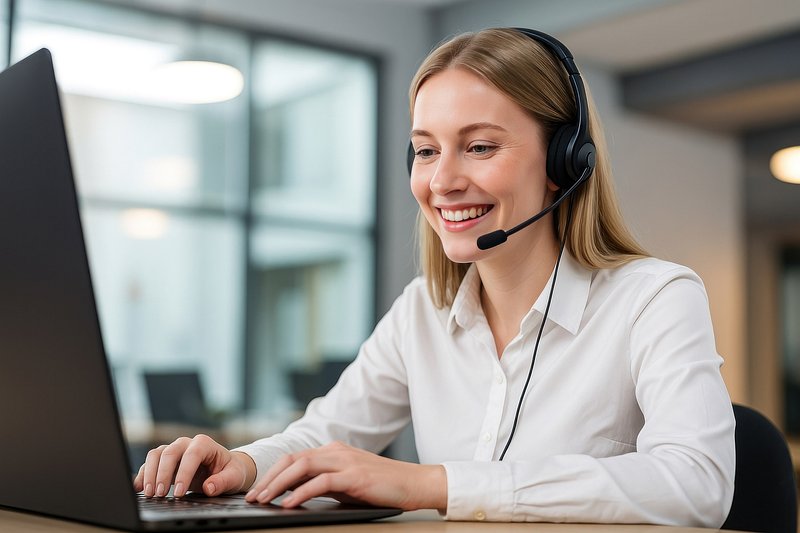 Smiling woman using laptop headset. https://www.rawpixel.com/image/17322760/smiling-woman-using-laptop-headsetView license