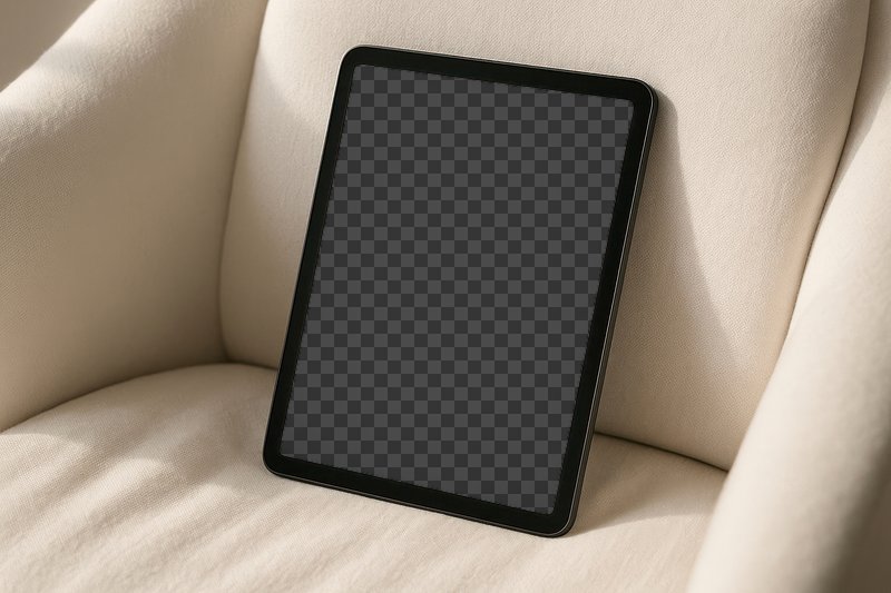 Tablet mockup on soft chair png, transparent design https://www.rawpixel.com/image/23888413/tablet-mockup-soft-chair-png-transparent-designView license