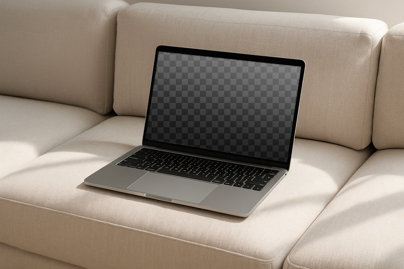 Laptop mockup on beige sofa png, transparent design https://www.rawpixel.com/image/23868753/laptop-mockup-beige-sofa-png-transparent-designView license
