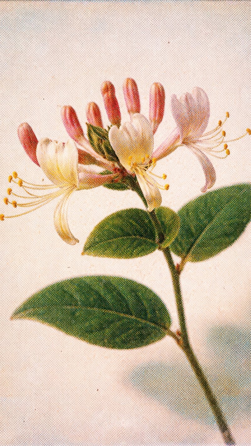 Honeysuckle flower vector vintage botanical art print, remixed from artworks by Pierre-Joseph Redouté https://www.rawpixel.com/image/2868361/premium-illustration-vector-pierre-joseph-redoute-vintageView license