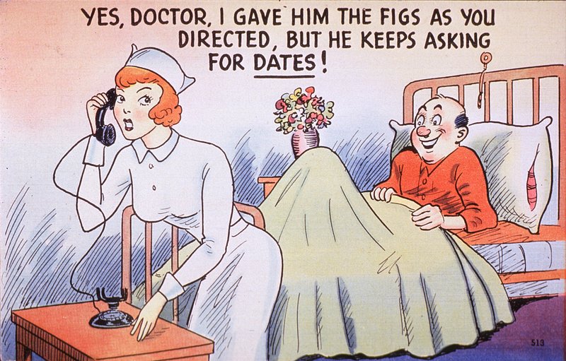 Yes, Doctor, I Gave Him The Figs As You Directed, But He Keeps Asking For Dates! https://www.rawpixel.com/image/11428813/image-cartoon-flowers-hospitalFree Image from public domain license