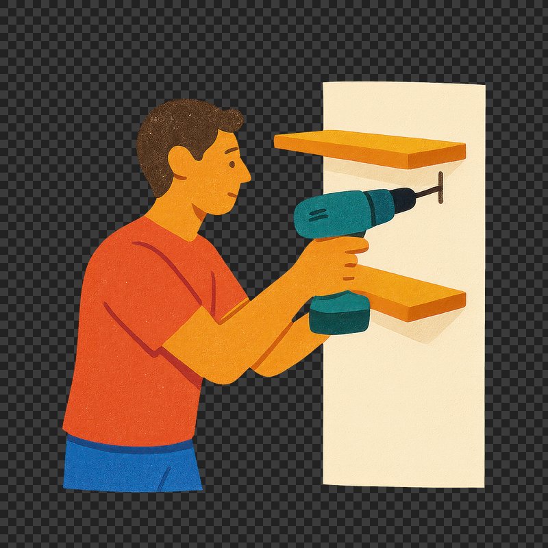 PNG Man drilling wooden shelves. https://www.rawpixel.com/image/22097861/png-man-drilling-wooden-shelvesView license