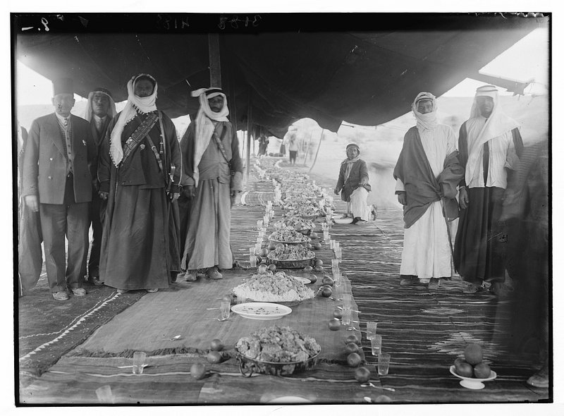 Pan-Islamic conference. Gathers at Shunet Nimrin, Transjordan. The dinner spread. On oriental rugs under long Bedouin tent… https://www.rawpixel.com/image/6823728/photo-image-people-art-menFree Image from public domain license