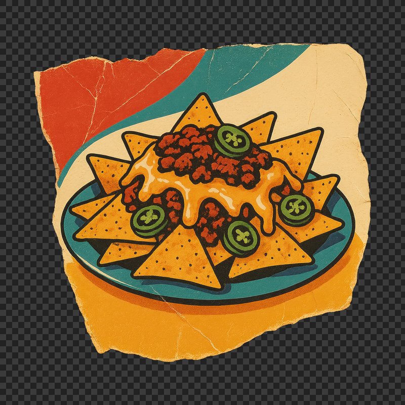 PNG Retro nachos illustration with cheese. https://www.rawpixel.com/image/24403968/png-retro-nachos-illustration-with-cheeseView license