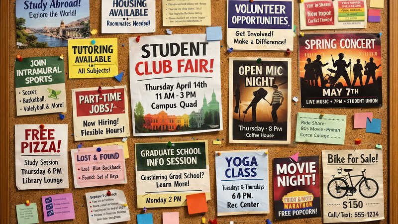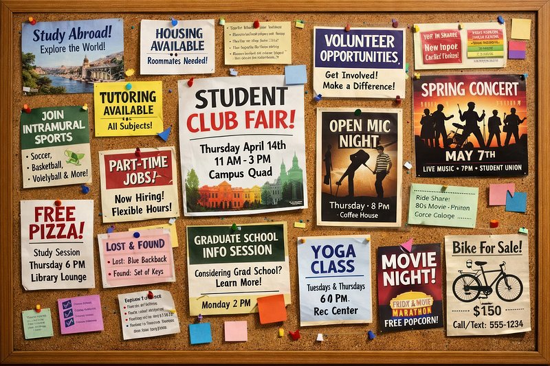 Bulletin board with colorful event flyers. https://www.rawpixel.com/image/25692323/bulletin-board-with-colorful-event-flyersView license