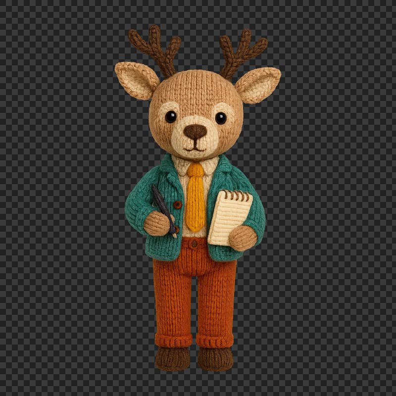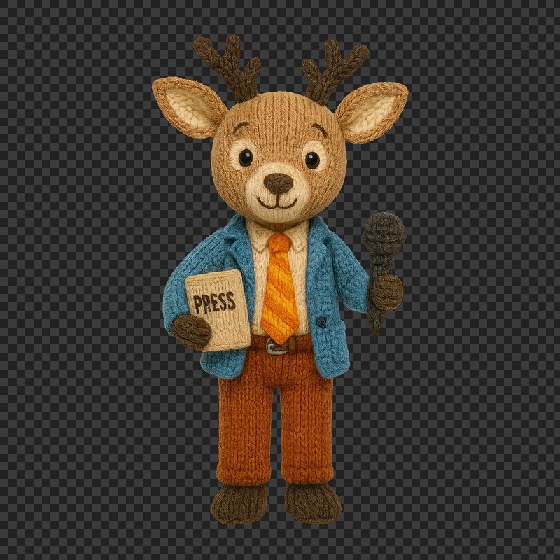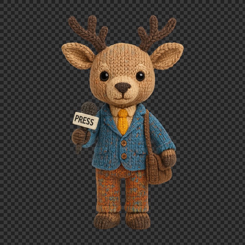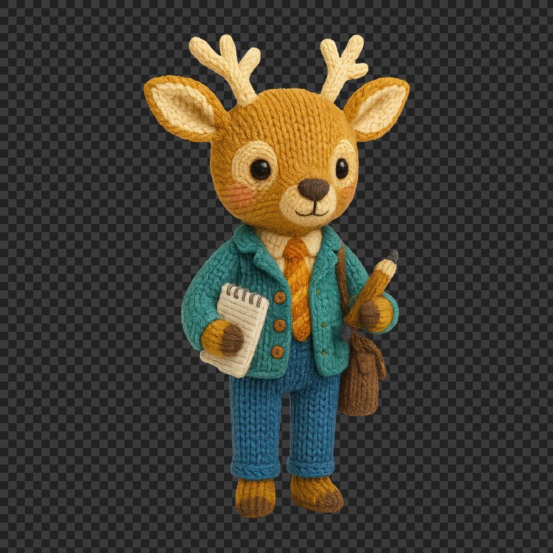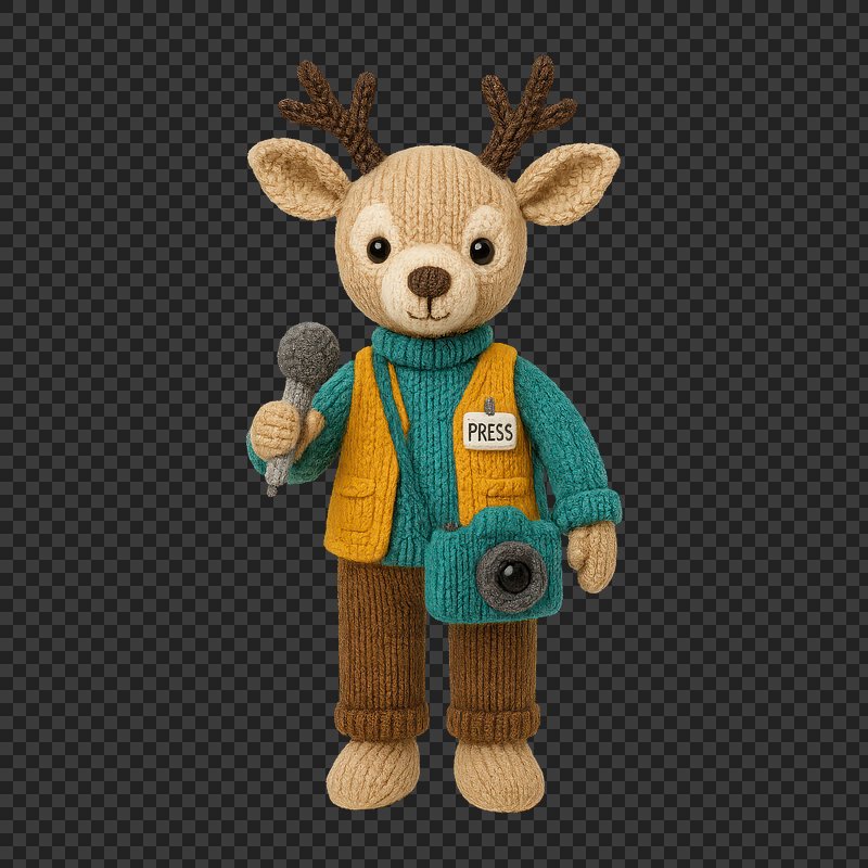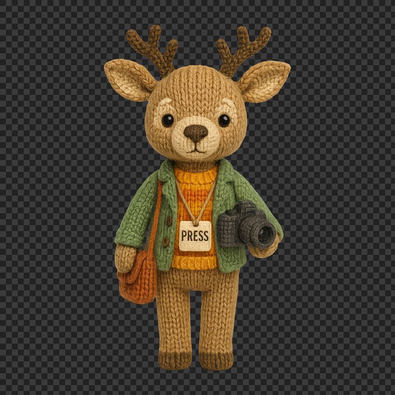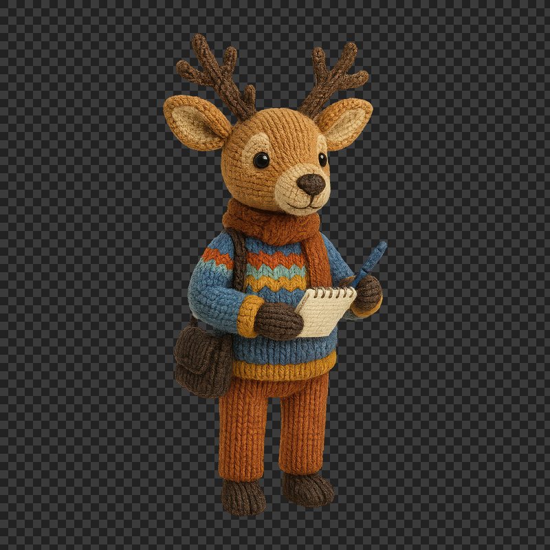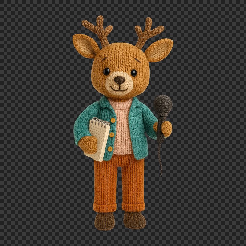 PNG Cute knitted deer journalist figure. https://www.rawpixel.com/image/24445424/png-cute-knitted-deer-journalist-figureView license