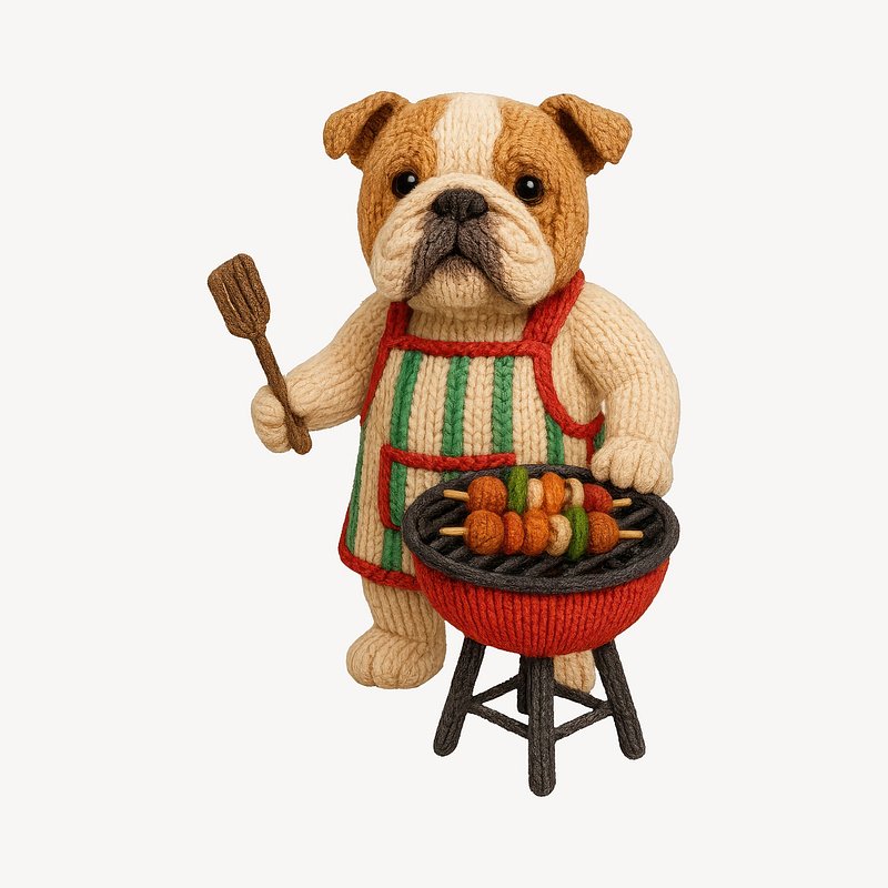 Knitted bulldog grilling kebabs. https://www.rawpixel.com/image/24534917/knitted-bulldog-grilling-kebabsView license