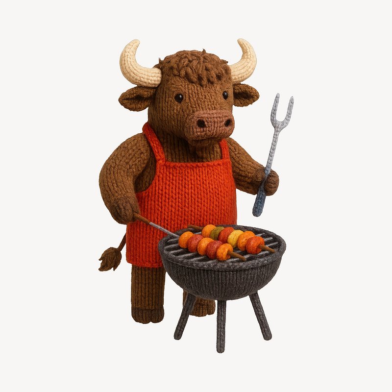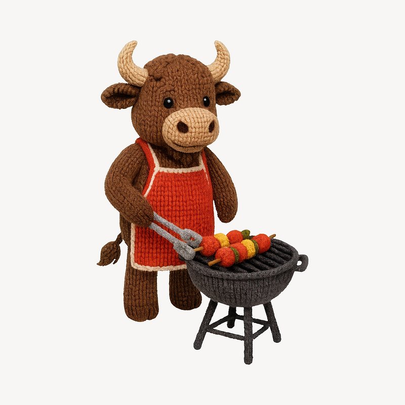 Knitted bull grilling kebabs https://www.rawpixel.com/image/24532176/knitted-bull-grilling-kebabsView license