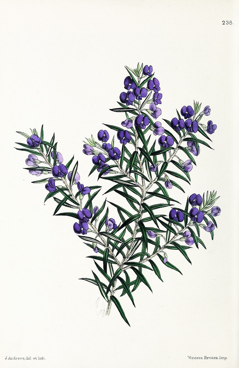 Hovea from The Floral Magazine (1861-1881) by Worthington G. Smith, John N. Fitch and Walter H. Fitch https://www.rawpixel.com/image/16662473/image-flower-plant-artFree Image from public domain license