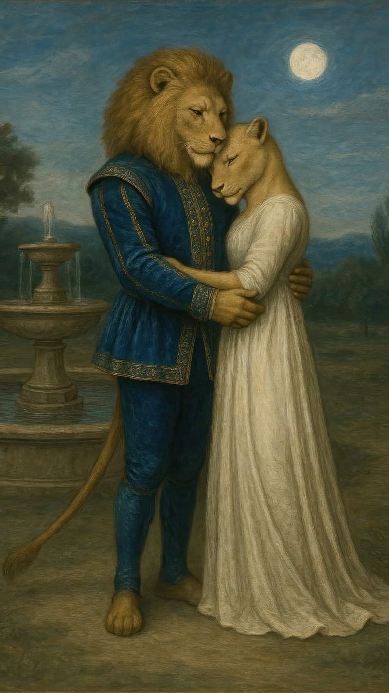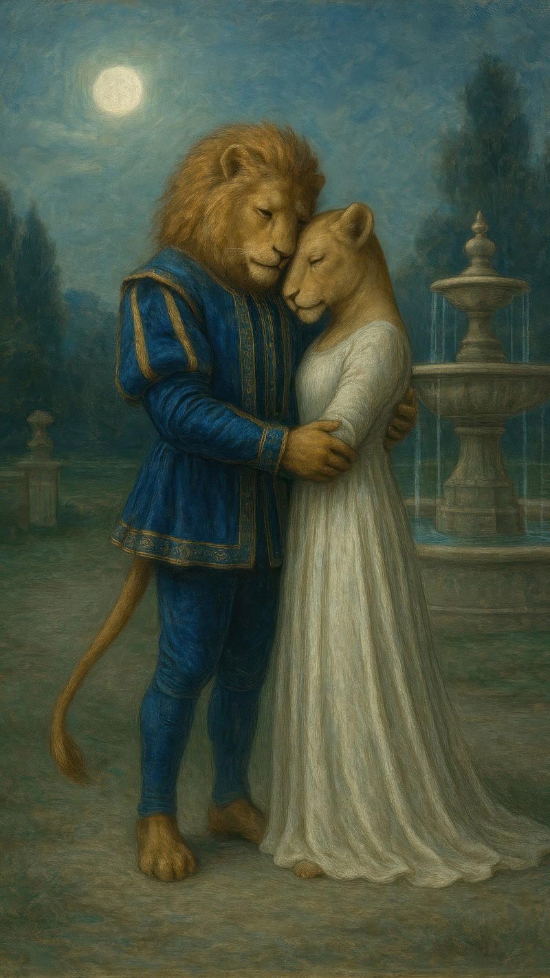 Romantic lions under moonlight embrace. https://www.rawpixel.com/image/18454718/romantic-lions-under-moonlight-embraceView license